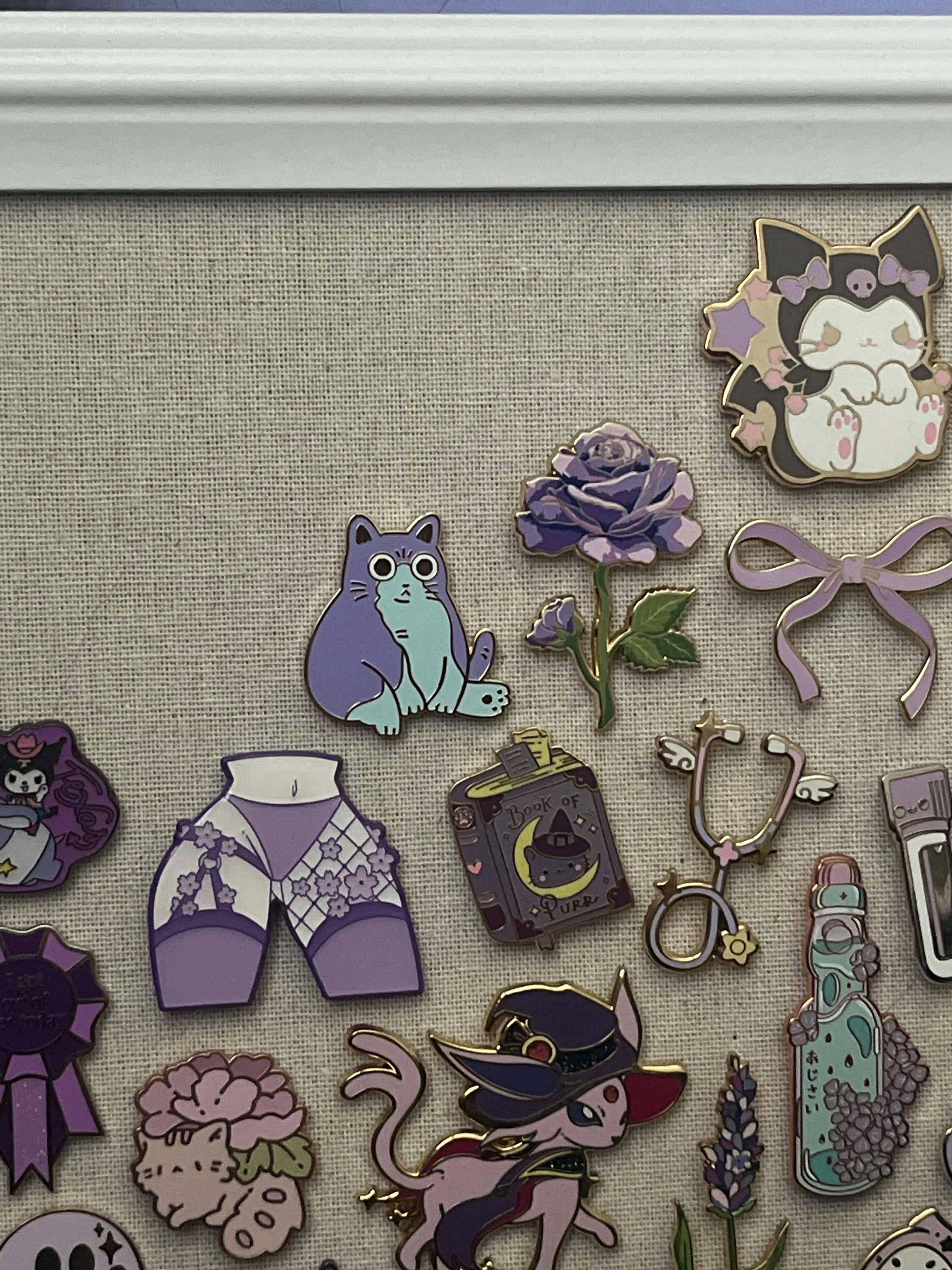 Who doesn't love a big-eyed chonky kitty? Add in a human pose and purrple coloring, and you have a purrfect pin. The quality is exceptional, and delivery was quick.
