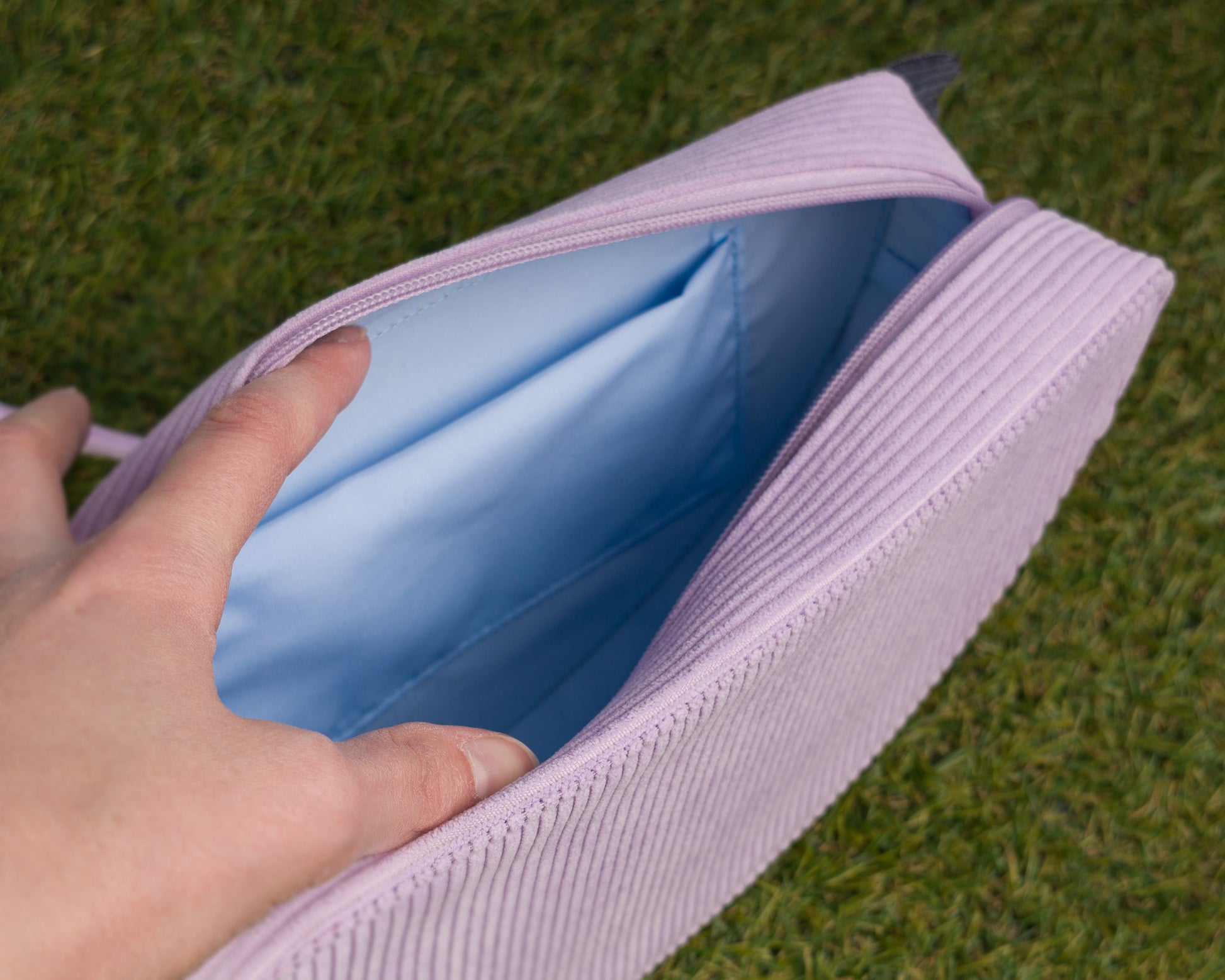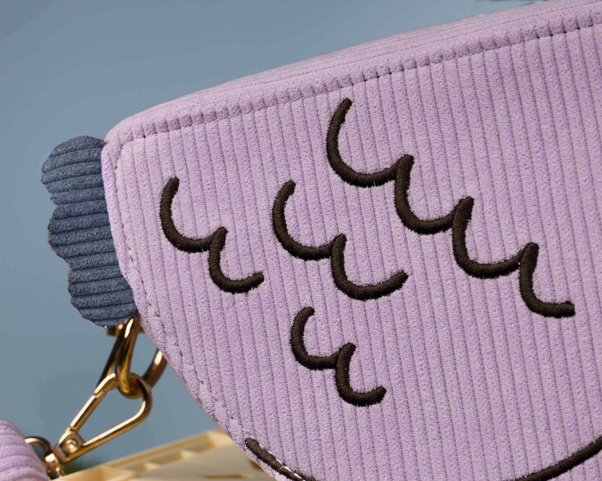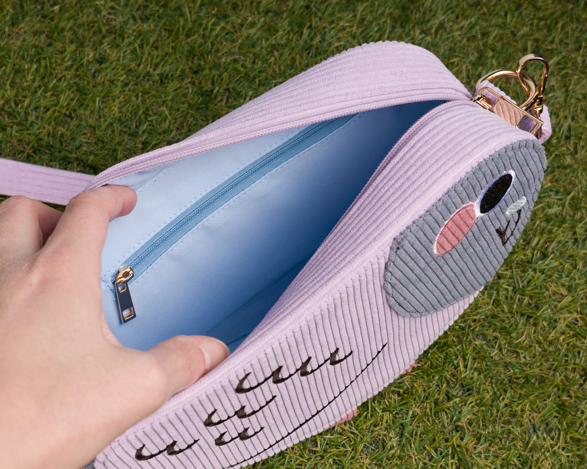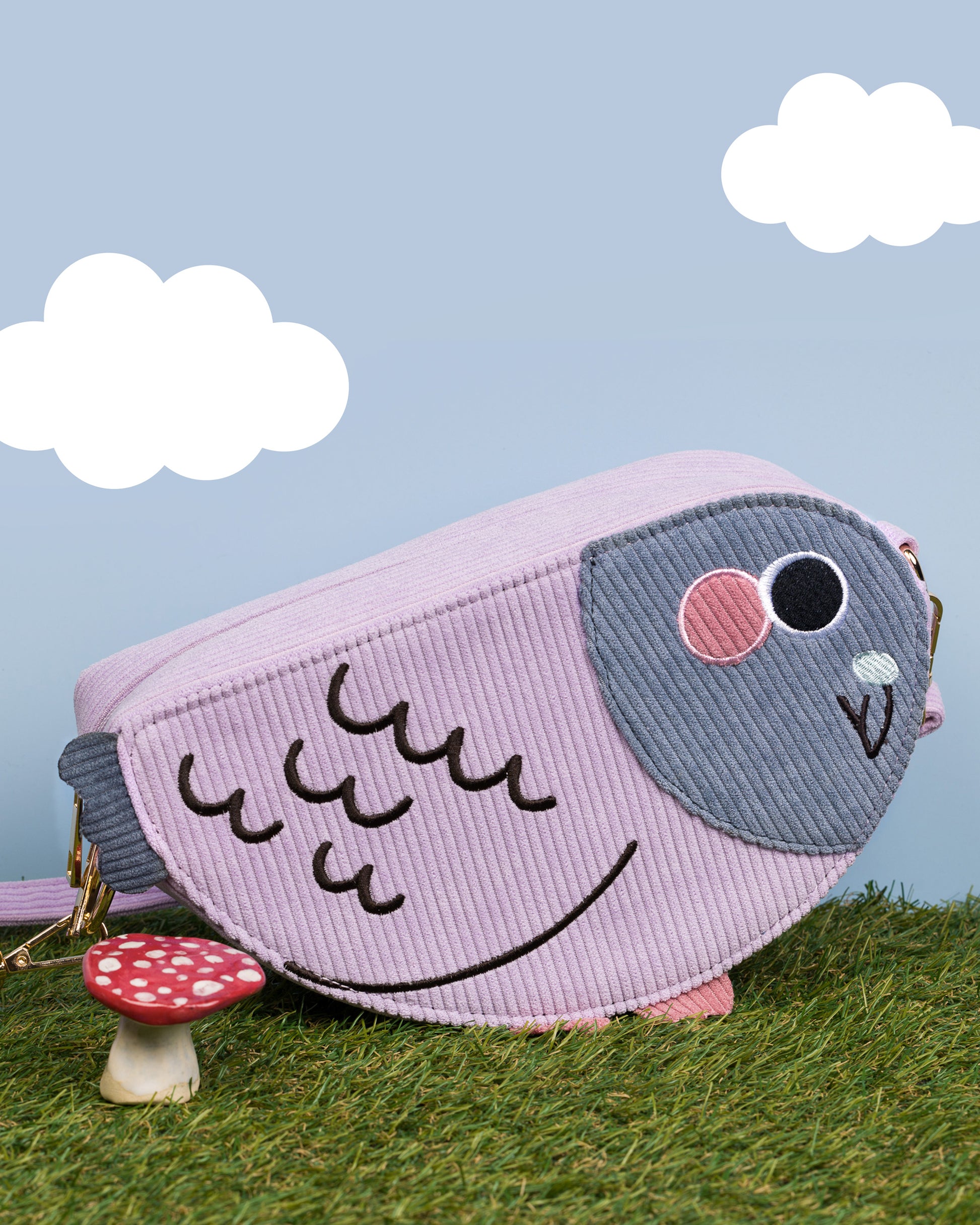 This cozy corduroy bag features an embroidered pigeon on one side and is designed to comfortably hold all your essentials—phone, wallet, glasses and keys.